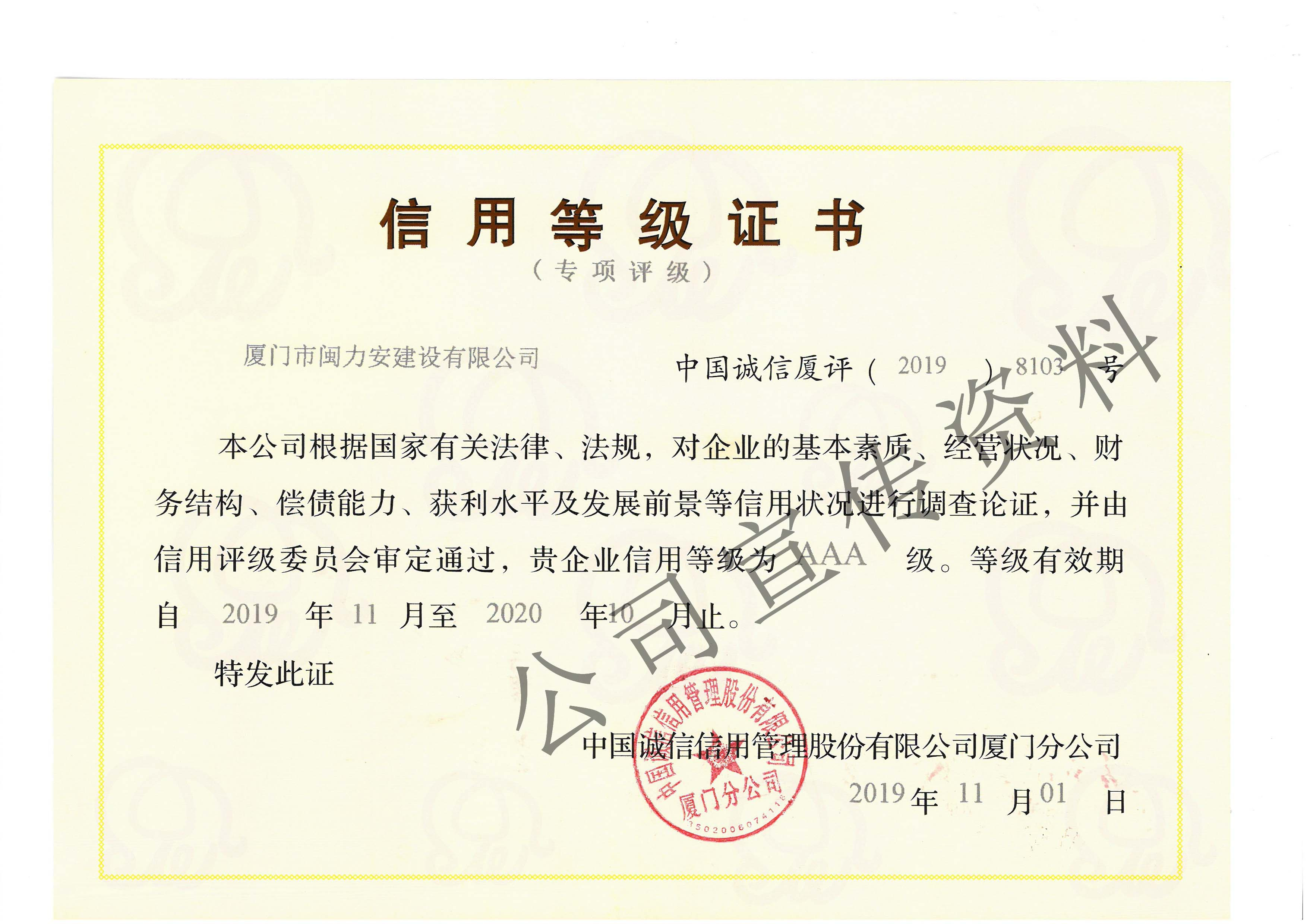 廈門市閩力安建設(shè)有限公司成立于2003年,公司取得市政公用工程施工總承包貳級、建筑裝修裝飾工程專業(yè)承包壹級、城市及道路照明工程專業(yè)承包壹級、電子與智能化工程專業(yè)承包貳級、消防設(shè)施工程專業(yè)承包貳級、電力工程施工總承包叁級、建筑機電安裝工程專業(yè)承包叁級、輸變電工程專業(yè)承包叁級、環(huán)保工程專業(yè)承包叁級、照明工程設(shè)計專項甲級、建筑裝飾工程設(shè)計乙級、施工勞務(wù)等資質(zhì)的綜合型企業(yè),公司于2013年通過了ISO9001質(zhì)量體系認證,ISO14001環(huán)境管理體系認證,OHSAS18001職業(yè)健康安全管理體系認證。